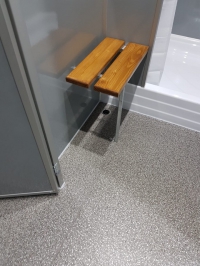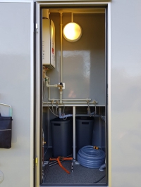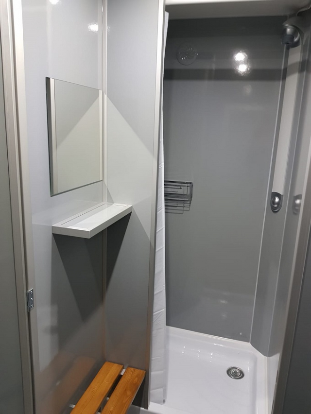 Wagen is voorzien van 5 aparte ruimtes met douchebak, en aparte omkleed ruimte